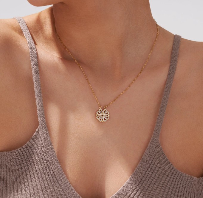 The Necklace can be worn in 2 ways: lucky Clover and romantic four Hearts. The pendant magnetically joins the hearts into the clover